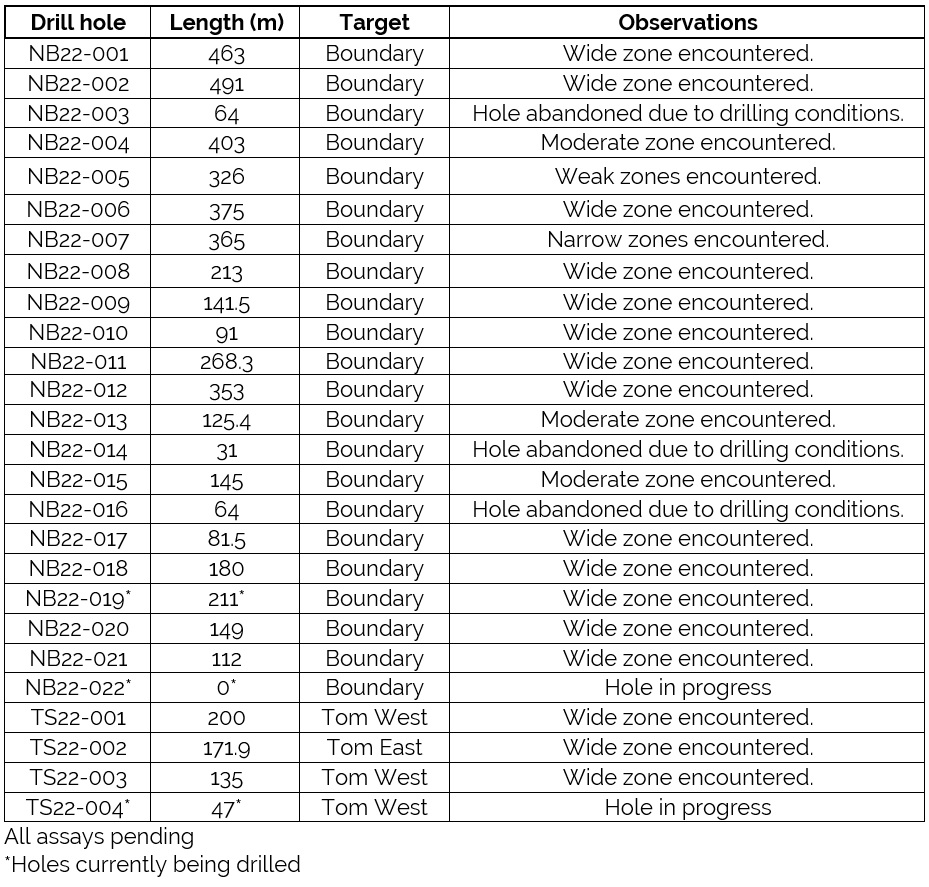 - Four diamond drilling rigs are currently turning on the property, two at Boundary Zone, and two at Tom West.