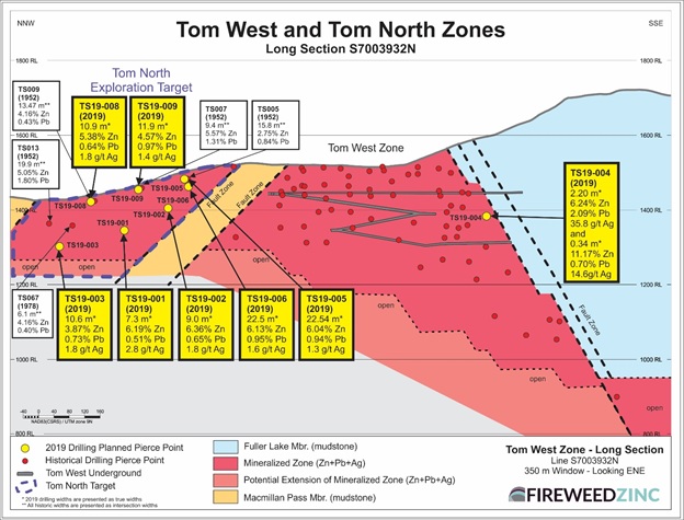 Tom East is the highest grade zone discovered on the property to date. In 2018, drilling extended the zone to depth with the deepest hole intersecting 16.4 m grading 21.14% Zinc, 13.55% Lead and 243 g/t Silver (Figure 5; see Fireweed news release dated September 20, 2018 for details). 2019 drill hole TS19-007 was planned to test the potential extension of the zone but the hole deviated from its planned course and drilled multiple down-dip intersections passing in and out of mineralization at very low angles to the zone. These high-grade infill results provide geological information that will inform geological modelling for resource expansion and exploration in the structurally complex Tom East zone (see Figure 5). The potential extension of the high-grade mineralization discovered in 2018 remains untested and Tom East is open at depth.