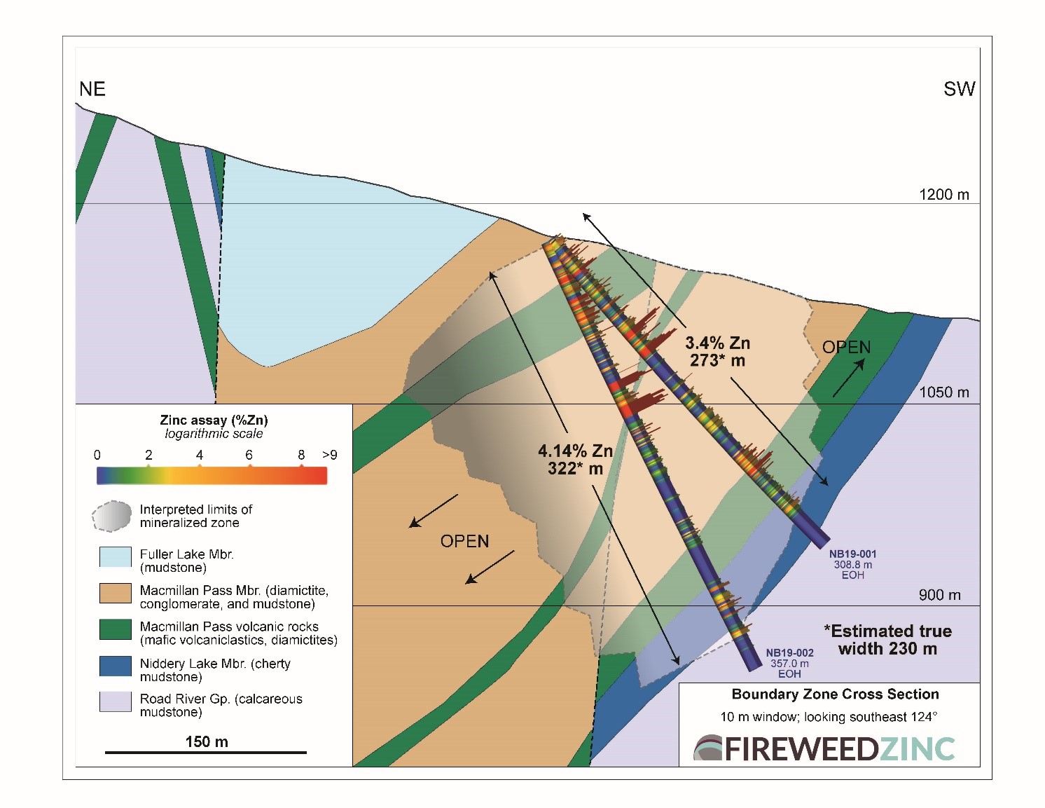 - This final 2019 drill hole at the Boundary Zone intersected 4.14% Zinc over a true width of 230 metres with a near surface higher grade section of 7.94% Zinc over a true width of 100 metres and high grade subintervals including 42.49% Zinc over 6.4 metres and local very high grade sections including >60% Zinc1 over 0.6 metres. The zone remains open to depth and along strike.