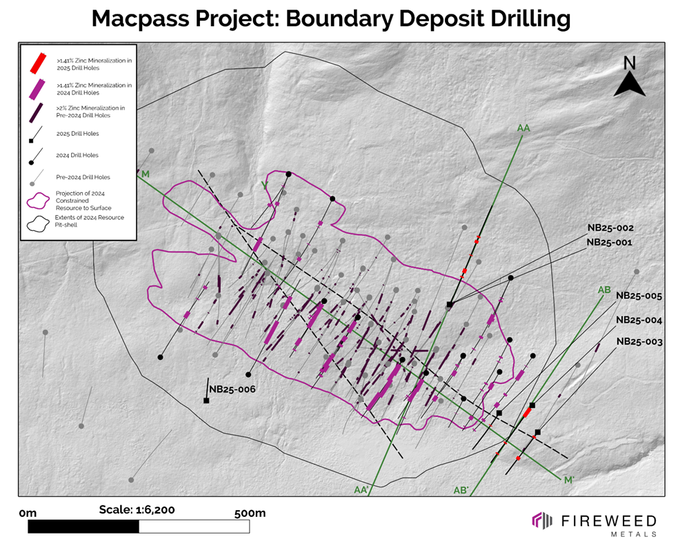 Vancouver, British Columbia: Fireweed Metals Corp. (“Fireweed” or the “Company”) (TSXV: FWZ; OTCQX: FWEDF) is pleased to report the results of the first drill holes from Boundary Zone targeting anomalies generated from the muon tomography survey as part of the 2025 drill campaign at its Macpass Project (“Macpass”), Yukon, Canada.