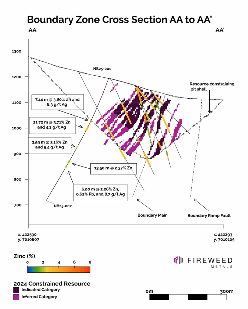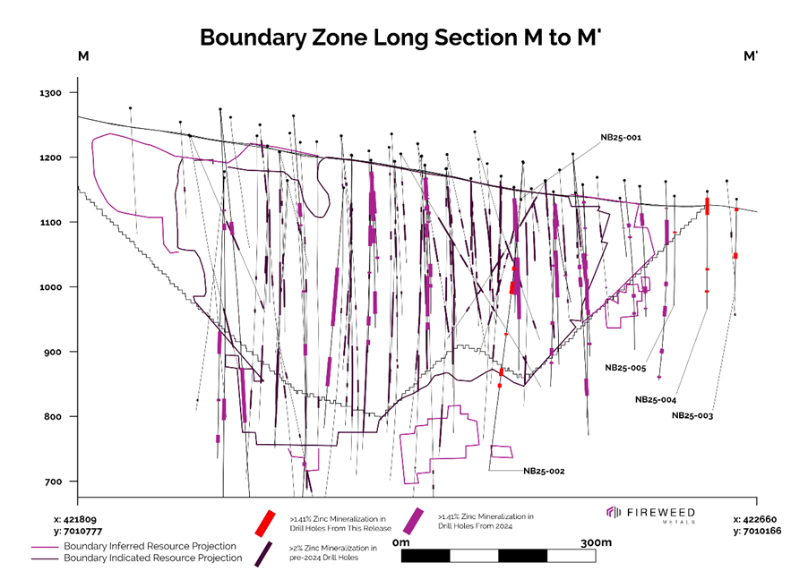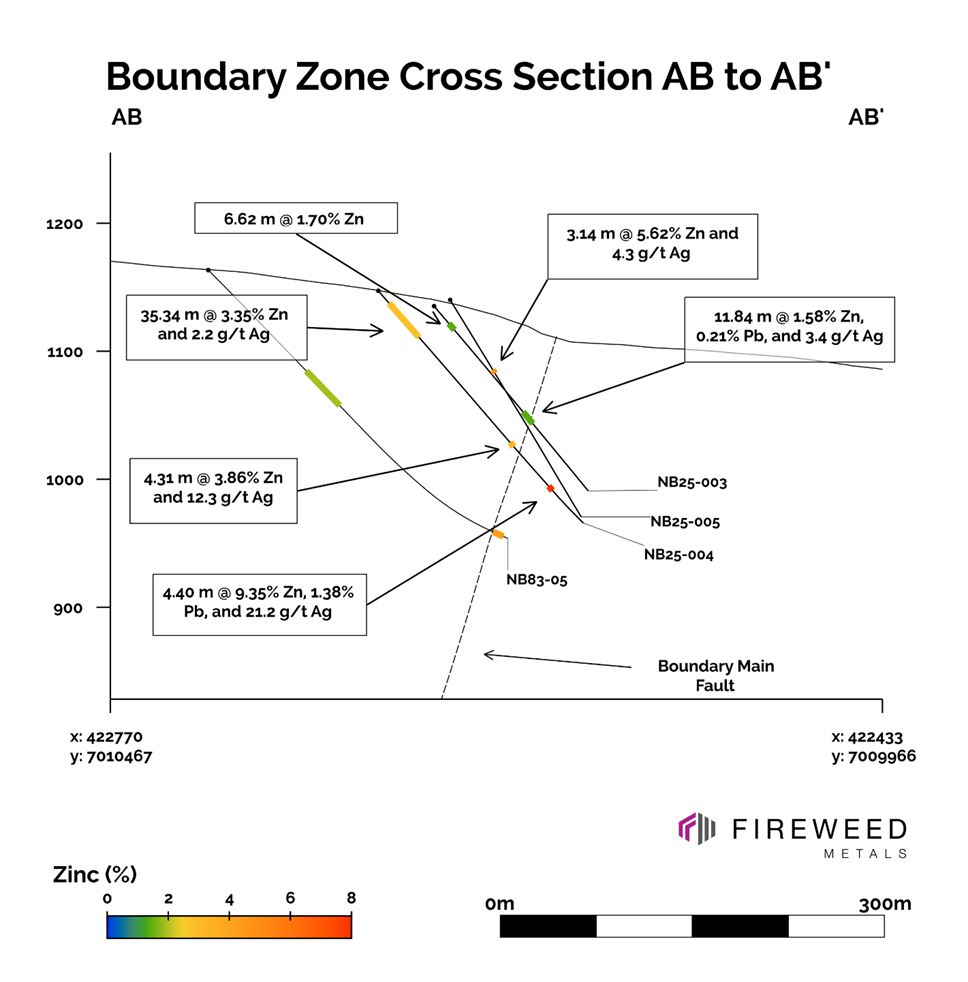 Hole NB25-004 was successful in intersecting a narrow expression of the stratiform to massive sulphide mineralization associated with the Boundary Zone Prime Zone. The remaining holes (NB25-003 and NB25-005) completed as step-outs to the eastern extent of the MRE were successful in intersecting various packages of replacement, vein, and breccia style zinc mineralization. In the north, NB25-002 intersected vein and replacement style mineralization. All mineralized intercepts are beyond the limits of the 2024 MRE1.