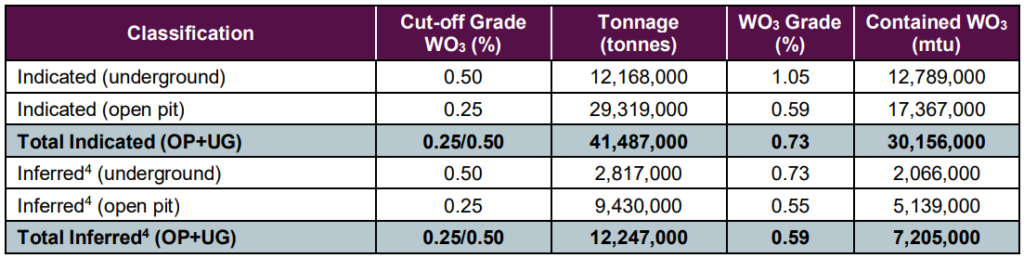 - Mineral resources total 41.5 Mt Indicated Resource at 0.73% WO3 and 12.2 Mt Inferred Resource at 0.59% WO3.