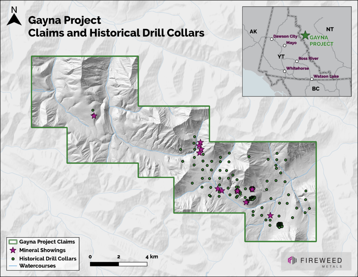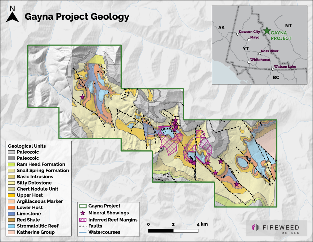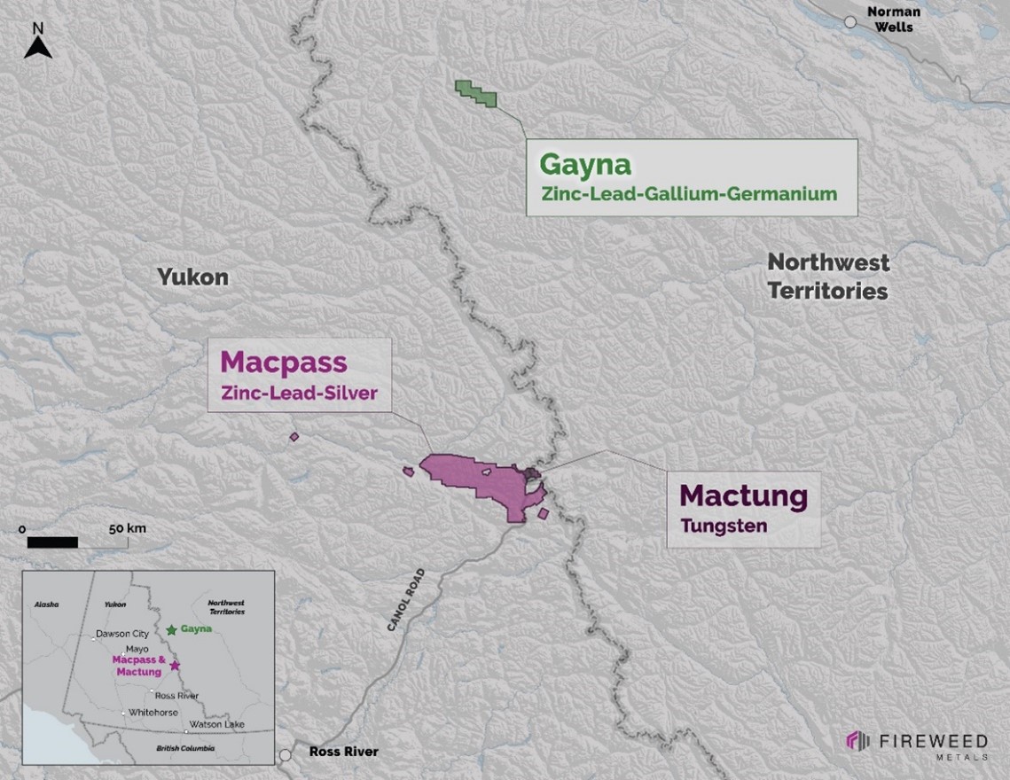 - Gayna Project (zinc-lead-gallium-germanium): Fireweed owns 100% of the 128.75 km2 Gayna project located 180 km north of the Macpass Project. It is host to extensive mineralization including Critical Minerals zinc, gallium and germanium as well as lead and silver, outlined by 28,000 m of historical drilling and significant upside potential.