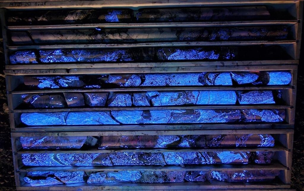 Photo 1: 82.47 m to 91.80 m in MT25-051 displaying high-grade scheelite (CaWO4) mineralization fluorescing under short wave UV.