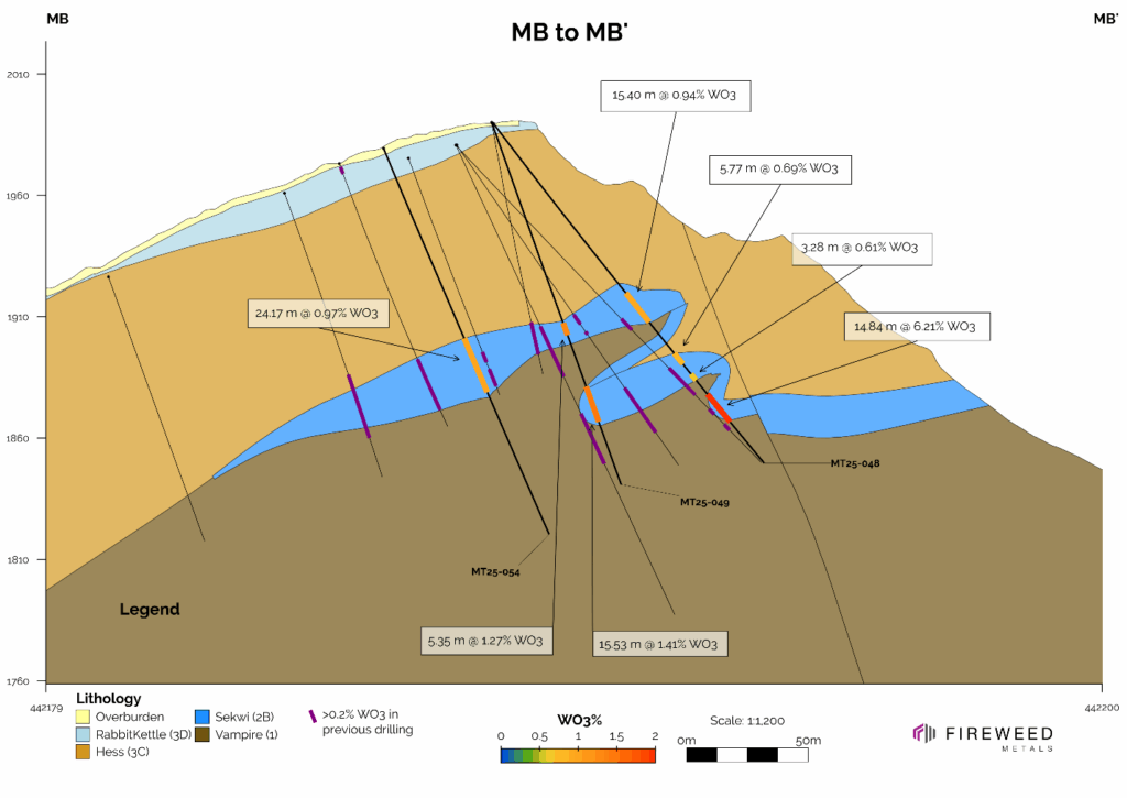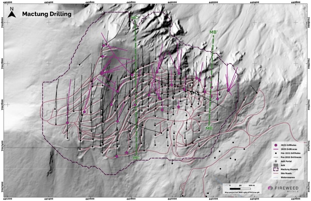 The 2025 drill program at Mactung comprised 11,117 m between a total of 66 holes. All assays have been received, and results for intervals that returned composite grades higher than 0.2% WO3 are reported here (See Tables 1 and 2, Cross Sections MB to MB’ and MC to MC’, Maps 1 and 2).