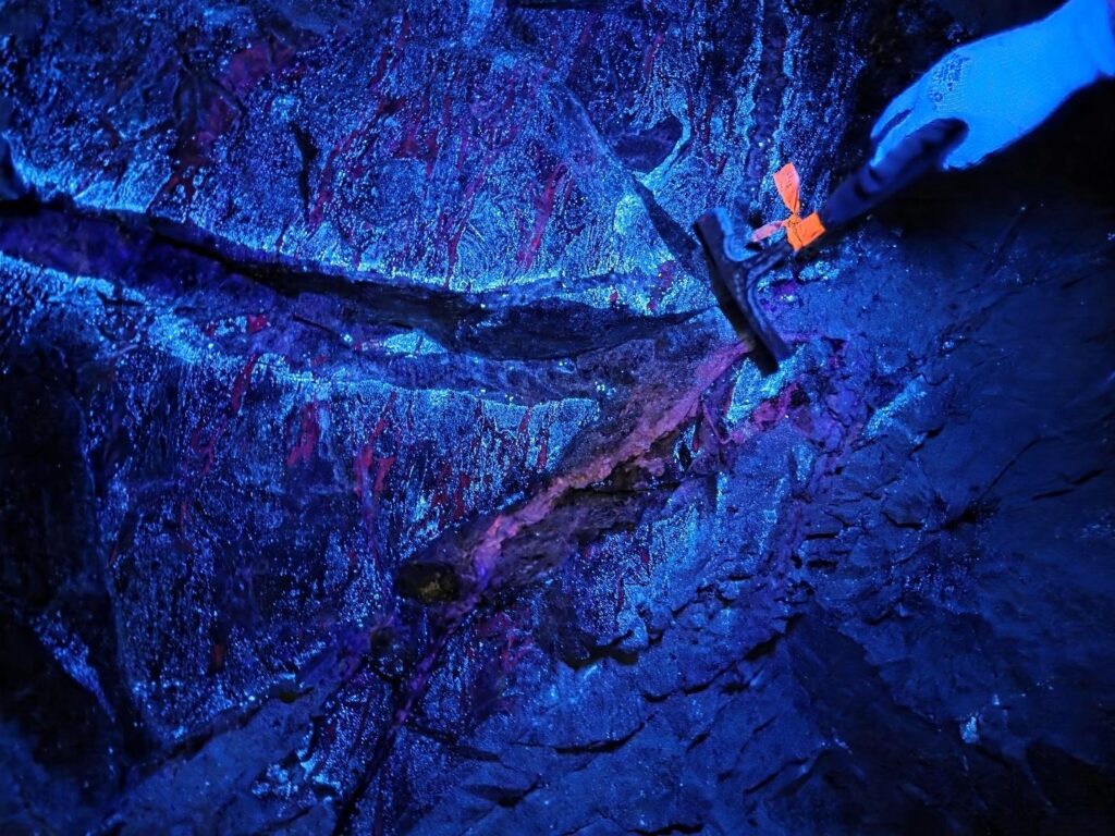 Photo 3: Scheelite (CaWO4) mineralization fluorescing under short wave UV in the Mactung Adit.