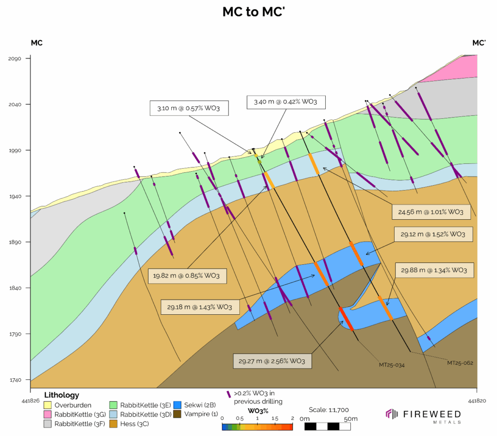 - MT25-034: 29 m true width of 2.56% WO3