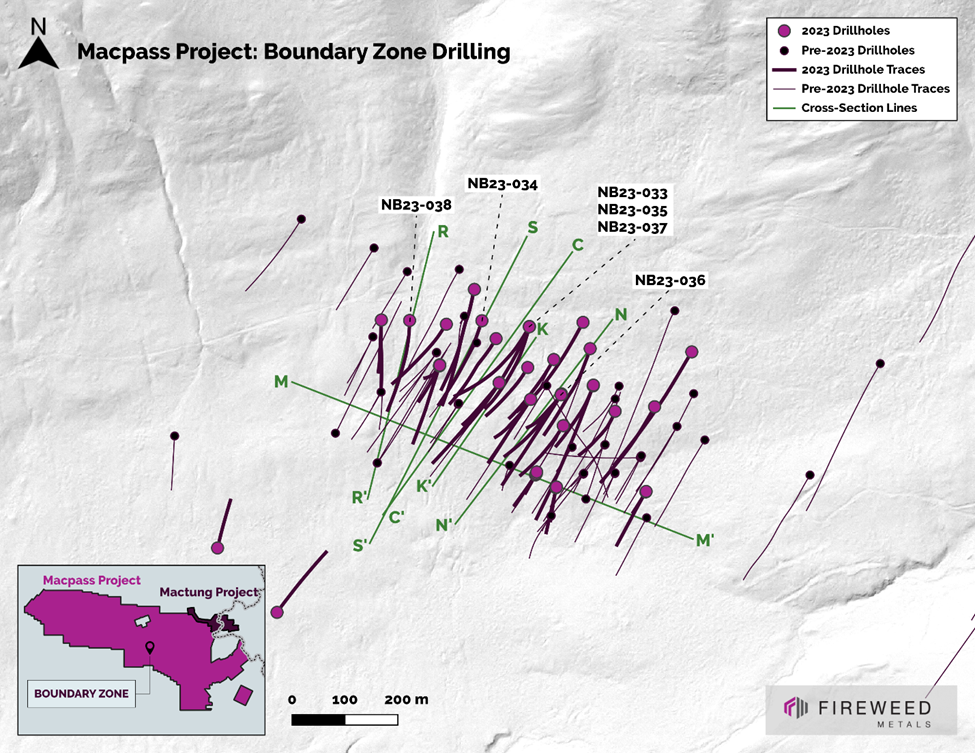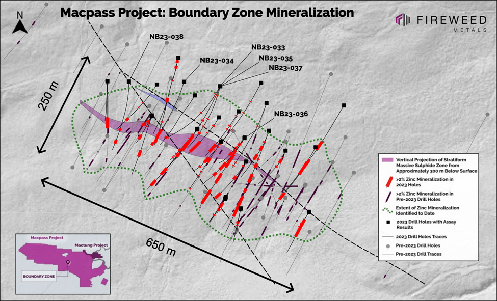 Vancouver, British Columbia: FIREWEED METALS CORP. (“Fireweed” or the “Company”) (TSXV: FWZ; OTCQB: FWEDF; FSE: M0G) is pleased to report the final results from the 2023 Boundary Zone drilling campaign at its Macmillan Pass (“Macpass”) Project, Yukon, Canada.