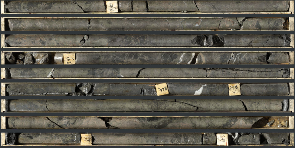 Photo 1: High resolution core scanning image of stratiform and massive to semi-massive sulphide mineralization in NB23-036 (239.6 m to 249.2 m)