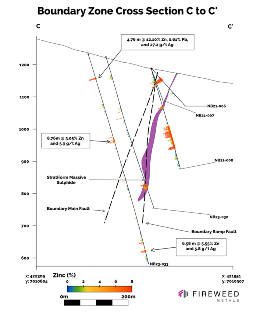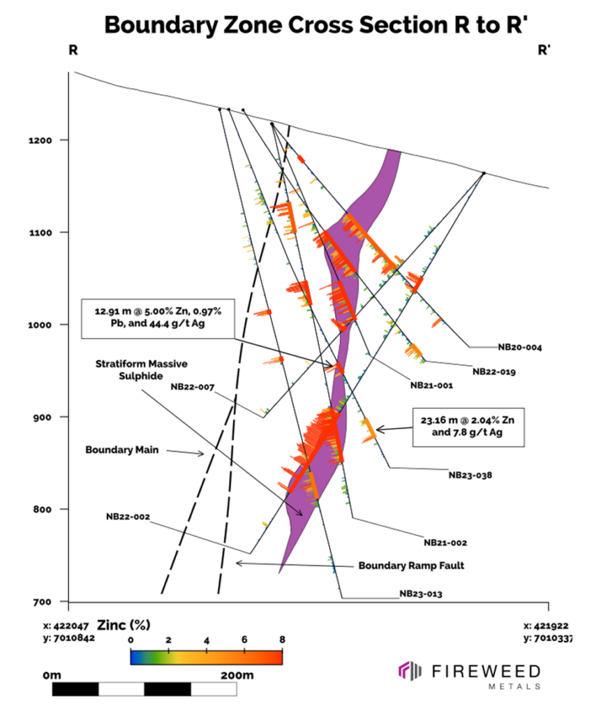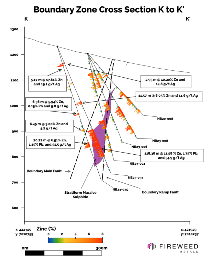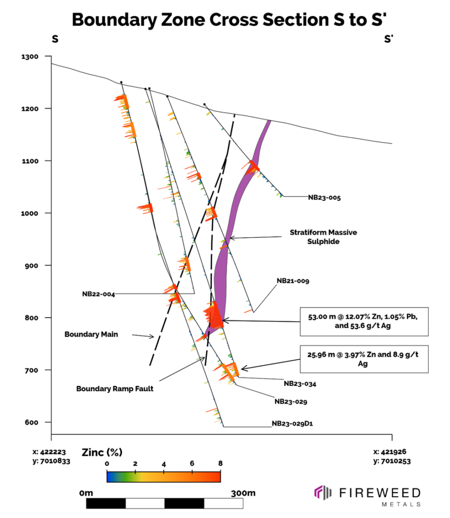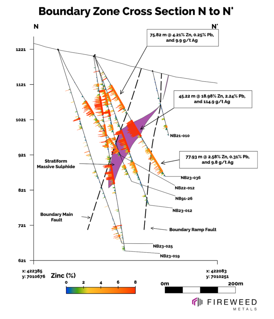 The mineralization from drill holes in this release primarily comprises stratiform (layer-parallel) and massive (>50% sulphides) sulphides in the western and central areas of Boundary Zone. This mineralization is sub-vertical with sharp margins, occurring from near-surface to at least a depth of 450 m and across a strike length of 550 m. We also report intersections of vein and breccia mineralization that occur on both sides of the tabular stratiform sulphide zones. The intersection in holes NB23-036 and NB23-037 continue to demonstrate high zinc, lead, and silver grades that are interpreted as forming from higher temperature fluids in association with a feeder zone supplying metals to a mineralized system.